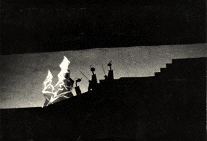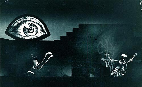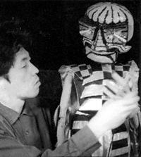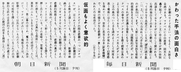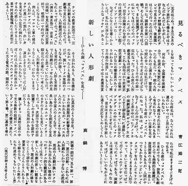ところで、『マクベス』をレパートリーに上げるに際して、私は劇団の新しい創造方針を出さなければならないと考えていた。そして、その方向づけのポイントになるものは、「人形はモノである」から出発することだと思っていた。 「モノ」と言っても、「物体」「物質」の「物」もあれば、「人間の身替り」という"思い"の込められた人形(物)もある。また日本語の中にある「モノ」「もの」「物」も考えてみた。 「ものの哀れ」や「もの寂しい」や「もの悲しい」「物語」「もの静かな人」「ものぐさ」「もの好き」「もののけ」「ものものしい」「もの分れ」や「噴飯もの」とか「書きもの」「はやりもの」「ほんもの」などを見ると、「もの」とは、「なんとなく」とか「なにか」とか「なぜか」とか「思うこと」とか「心」とか「魂」とか「とても」とかが含まれているように思える。 すると、人形劇の人形の魅力は物体であることの面白さや長所と、「魂」や「心」を造型化した物としての魅力を基本として、人形操演者の憑依によるオーラを加え、時と所を越えた世界へと観客を誘い、共同体験をして貰えることが基本なのではないだろううか。 私は、そんな風に考え始めていた。だから『マクベス』の稽古の中で、マクベス夫人を演じている宇野小四郎の演技を見た時、「これだ」と感動したのだ。須田くんのガッチリした演技も魅力的だったが、「オリジナリティーが欲しいよ。」と言った渋沢兄の視点から見れば、宇野のレディ・マクベスの操演こそ、新しい今後の演技の出発点だったような気がしたのである。 その渋沢さんは、東横ホールに観に来て、片岡昌の人形の面白さと、宇野小四郎の演技の面白さ、そして私の演出の面白さを評価し、嬉しそうに帰って行った。 そう言えば、私は『マクベス』の片岡人形のことを記すのを忘れていた。『マクベス』の成功は、片岡の人形を除いては考えられない。『マクベス』の一寸前に、片岡は宇野の『盗まれた天文台』をやっており、その中で『マクベス』人形の方向性は既に顕われていた。更に言えばその前の『悪魔のおくりもの』にも、その兆候は出始めていたと私は思っている。 その頃、私共は安部公房に興味を持ち、花田清輝や岡本太郎に傾斜していた。そしてピカソを崇拝していた。そのピカソがアフリカの仮面や木彫像などに衝撃を受け、影響されたという伝説は余りにも有名であったし、岡本太郎さんがそのピカソに「日本にはアニメーション作家の大藤さんという優れた方がおいでですね。」と言われてショックを受けられたとか・・・。 そんな話が聞こえてくる中にあって、私は宇野小四郎と共に片岡に「ね、アフリカの仮面のような人形作って『マクベス』をやってみようよ。」「そして、音楽はモダン・ジャスとミュージック・コンクレートというシュール・リアリズム音楽をあわせて使ってみようよ。」 それに続いて私と宇野は音楽の秋山邦晴さんを口説くことにして、当時秋山さんのお宅があった明大前へ向かった。秋山さんは明大前駅近くの神社内の一寸オシャレな家に住んでおり、大きな犬を家の中に飼っていた。私と宇野が話をすると、秋山さんはすぐ話にのってくれた。いや、大乗りにのった!と言うべきだろう。私が「モダン・ジャズとミュージック・コンクレートでやりたい。」と言ったからかもしれないが、興奮気味に「やりましょう!」と言って貰えたその声には、傍にいた大きな犬も驚いた様子だった。 下記は一九六一年公演の『マクベス』のスタッフとキャストの主なところである。