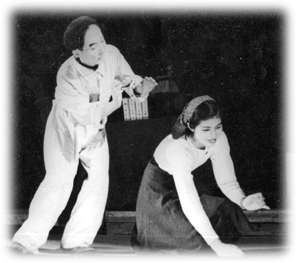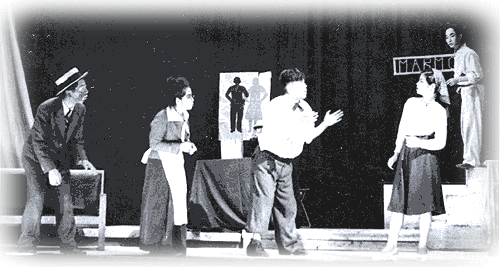 コッちゃんについては、第三回「江田法雄」のところで、小山内薫『息子』でのトチリ談中で触れているが、併演していた寺島アキ子作『モルモット』二幕に関しては、江田が出演していなかった為触れなかった。ここで改めて紹介しておこう。演出と美術は私(渡辺信一)。初演は一九四七年(昭和二十二年)の秋で、劇団名は「ひとみ座」ではなく、「鎌倉青年芸術劇場」だったが、その時の資料がない為、一九四九年(昭和二十四年)の七月十六日夜の横須賀市民会館ホールでの劇団ひとみ座公演バージョンをここに掲載しておく。スタッフ・キャストの大半は初演と変わってないが、大金持の姪は乾多鶴子さんではなく、比嘉さんだし、書生は宇野家に下宿していた庄司龍ちゃんではなく鈴村君になっている。![]() ※向って右奥(上手奥)にいるのが貧乏画描きに扮したコッちゃんこと宇野小四郎、当時19才。その左の女性はこの家の主人の姪役の比嘉令子(17才)、その左が主人で大金持の伯父役の私(筆者・渡辺信一、21才・・・この頃はまだ清水浩二の名を名乗っていなかった)、その更に左が、この家の家政婦役の中村愛子(22才)、そして一番左の顔を黒く塗っているのが書生役の鈴村健二(17才)。