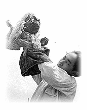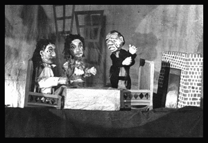 二月中旬の寒い夜に三島駅のホーム下の地下道で「鎌倉へ帰ろう」と列車を待っていた時のこと、余りの寒さにオーバーの襟を立てて足をバタバタしていると、恰幅の良い中年の紳士が酔っ払った感じでやって来て、コッちゃんに声をかけた。「おい、婆さん、寒いのかい?」長髪に蒼白い顔をした小柄で痩せていて黒いコートの襟を立て蹲(うずくま)るようにしていたコッちゃんは、無論返事をしない。酔っぱらいは、しつこい。そこで私は「小父さん、この人は婆さんじゃないんだよ。」と言うと、「ヘヘッ、酔っぱらってるからって、人をからかう気かあ・・・?」と言ったので「小父さんこそ、この人をからかってるじゃないか!この人はれっきとした男性だ。宇野小四郎という青年だよ。」このやり取りを近くで聞いていた木内さんが僕のところへ来て「あとは、僕に任せて下さい。」と言うので、お任せしたのだが、この木内さんという人、仲々したたかで、列車に乗って熱海に着くまでの間に件の男性と話をつけ、我々一同七名(清水浩二、中村愛子、宇野小四郎、木内赳、村田早禾、市川八郎、藤井八千代、)は、熱海の山上にある望洋閣という一級旅館に招待され、一泊することになったのである。勿論、ご馳走もお酒も出、代りに襖を横にしたケコミで、『和尚さんと小坊主』をお座敷上演。「やんや」の喝采を受けた。が、翌朝は件の男性の顔が気のせいか青ざめて見えていた。が、彼は、「お願いがあるが・・・実は私の家内が経営している幼稚園の子達に人形劇を見せてやってくれないかな」と言われ、私は言うまでもなく、二つ返事で引き受けた。この男性は、熱海の有名人らしく、昨夜列車を降り立ったとき、客案内に立っていた十人程の人達が一斉に「旦那!お帰んなさいまし!」と挨拶をしていた位だったが、私にはそのことよりも「うちの家内の幼稚園の子供達に人形劇を見せてやってくれないかなあ。」と言われたことに感動してしまった。私は上演を承知した時、"ノーギャラで見せて上げよう"と思っていたのだが、上演後、食事を出して頂いた上、上演料も頂き、大変恐縮してしまった。当時の私共にとって、それは素晴らしい恵みだったとも言えよう。もうあの小父さんは天国だろうが、時々会ってみたくなる人である。 |