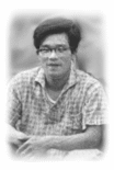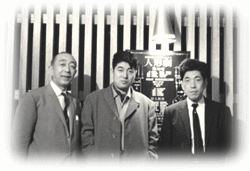 ![]() 「狂人教育」録音の際、旧草月会館ロビーにて撮影 左より益田喜頓、寺山修司、清水浩二 の各氏 |