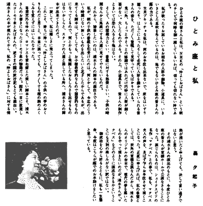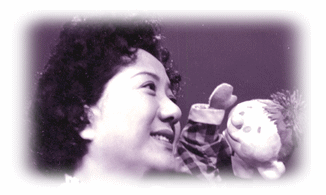 ←左は、NHK「仲よしおばさん」リハーサル中に筆者が撮影した轟夕起子さんの貴重な写真。轟さんが声の出演をされた「マクベス」のプログラムにもこの写真を使用している。一緒に写っている人形は、ヨッちゃんという名前で、片岡昌氏デザイン・製作。 |