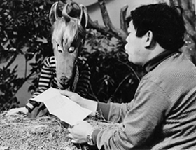 TVやイヴェントの物はもう少し書いているけどね。例えば、OTVっていう大阪TVのは・・・・・原作のあるヤツをTV用に書き換えたのが2本。NHKの名古屋JOCKってやつのが1本。それから、ダークダックスの「アヒルの国」っていうのにかんだんだけど、2年間だけ。毎年、11月の上旬にダークが中心で、黒柳徹子と横山道代と里見京子と3人が出て、あと谷内六郎さんがお絵描きの方で出てね。ダークが歌って、谷内先生が絵を描く。徹子の司会で。そのあとで人形劇を演る。・・・1回目の演目は、須田輪太郎の「お馬に化けた狐どん」っていう作品。これはね、賞を貰った作品で須田輪太郎の最高の傑作なんです。ただ、ダークさんとか黒柳さんでやるにはミュージカルっぽくしなきゃいけないというんで、僕が潤色・演出したけどね。 |
